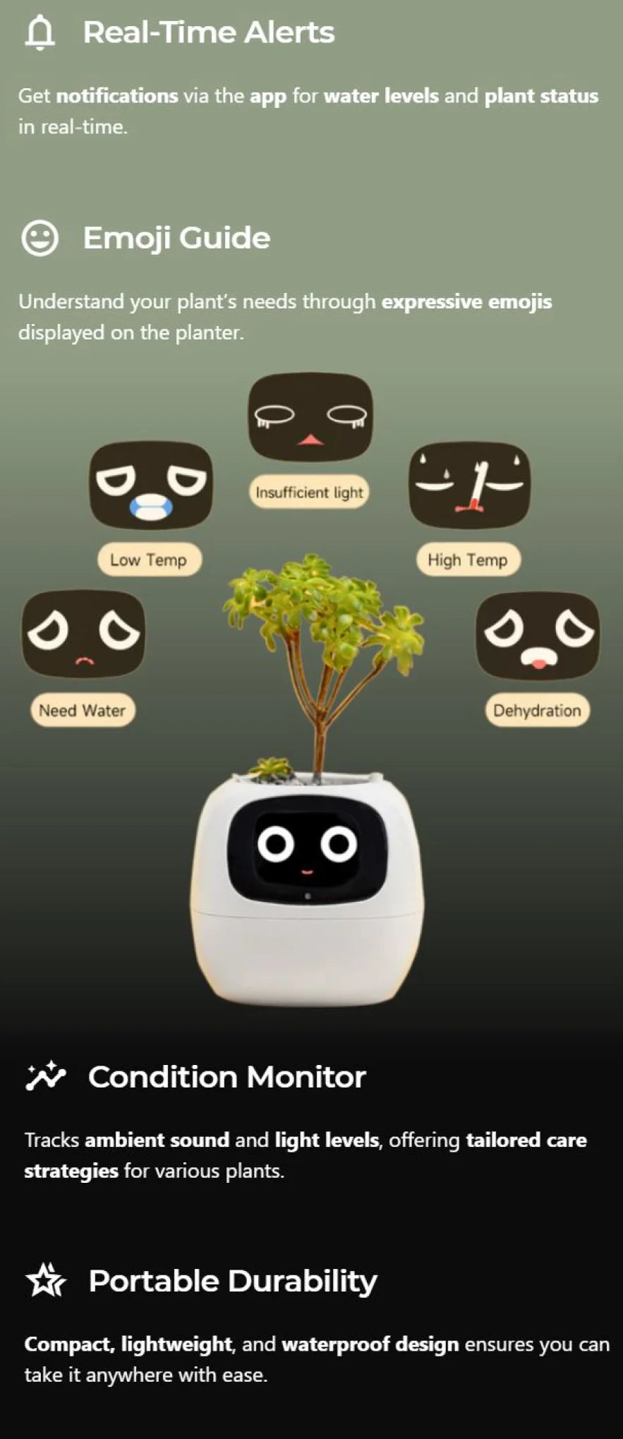 Enhance your space with a smart planter that monitors plant health in real-time. Available in five colors, it alerts you when water or light is needed. Simple USB charging makes it convenient, ensuring your plants thrive effortlessly.